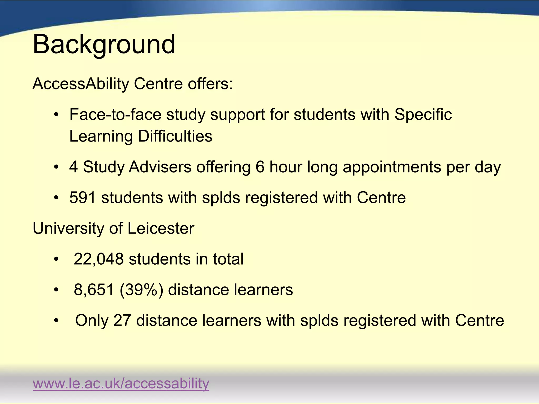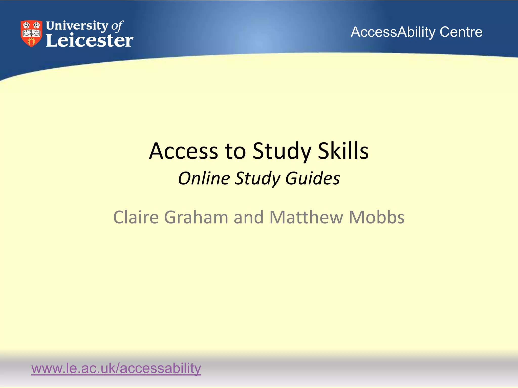 The document discusses the accessibility services offered by the University of Leicester's Accessibility Centre, including support for students with specific learning difficulties and the introduction of online study guides. Feedback from students indicates a positive reception, noting the guides' effectiveness in catering to various learning styles, while also highlighting areas for improvement such as text size and pacing controls. Future plans include remote one-on-one study advice sessions and making study guides more accessible to all students seeking support.