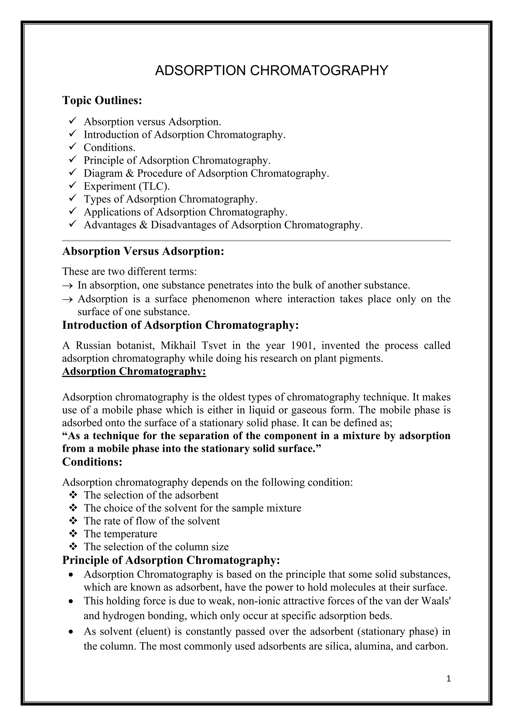 Adsorption chromatography is a technique for separating components in a mixture based on differential adsorption of the components onto a stationary solid phase. It works by passing a mobile liquid or gas phase over an adsorbent stationary phase in a column, which causes components to separate as they are differentially retained on the surface of the adsorbent. Common types include thin layer chromatography, paper chromatography, and column chromatography. Adsorption chromatography has various applications such as separating amino acids, isolating antibiotics, and identifying carbohydrates.