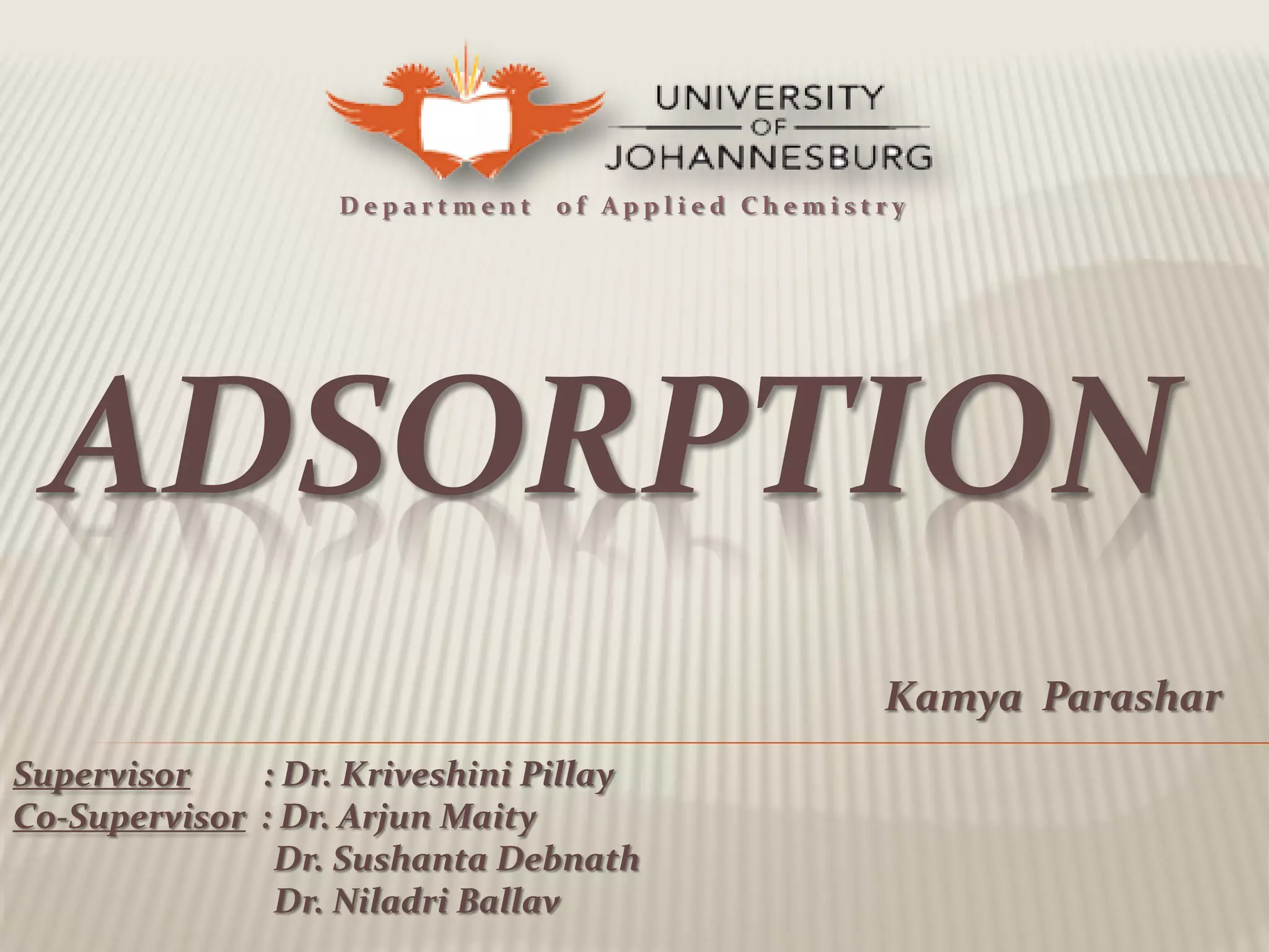 The document presents a comprehensive overview of adsorption, covering its basic principles, types (physisorption and chemisorption), factors affecting adsorption, adsorption isotherms, and kinetics. It describes key models such as Freundlich, Langmuir, and BET, as well as various applications and commercial adsorbents. Additionally, it discusses thermodynamics associated with adsorption processes, emphasizing the exothermic nature and spontaneous conditions.