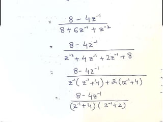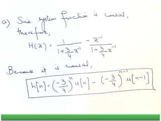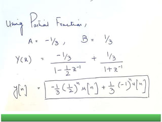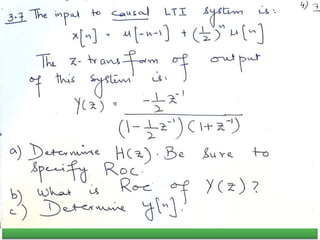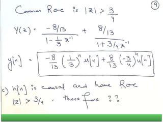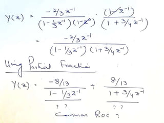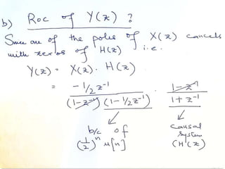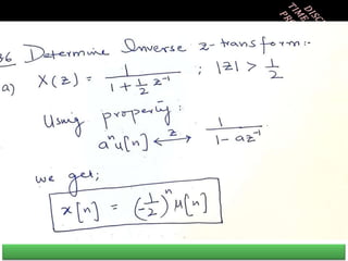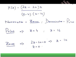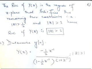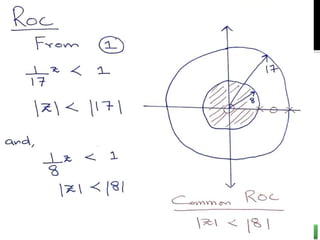 The document summarizes key concepts about the z-transform, which is the discrete-time counterpart of the Laplace transform. It describes the z-transform definition and how it relates to the discrete-time Fourier transform (DTFT). The region of convergence (ROC) is defined as the set of z-values where the z-transform converges. The ROC depends on whether the signal is right-sided, left-sided, or two-sided. Examples are provided to illustrate the ROC for different types of signals. Properties of the ROC like its shape and relationship to system stability and causality are also covered.