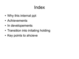 The internal presentation outlines Aspectus Ltd's achievements, ongoing developments, and plans for strategic partnerships and radio program launches. It highlights a transition into a holding structure, acquisition strategies, and financial targets, including funding rounds and IPO plans for its daughter companies. Key objectives include leveraging networks, enhancing information sharing, and achieving financial sustainability through diverse projects across various regions.