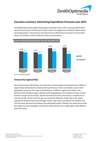 Zenith Optimedia predicts global ad expenditure will grow 4.2% in 2015 to $531 billion. Growth is forecast to be slower than previous estimates due to weakness in Latin America from low commodity prices and Brazil's economy. Ad markets are grouped into regional blocs based on geographical proximity and performance similarity. Forecasts are provided for each bloc between 2014-2017, with Fast-Track Asia expected to see the strongest growth while Eastern Europe & Central Asia will see declines due to issues in Russia, Ukraine, and Belarus.