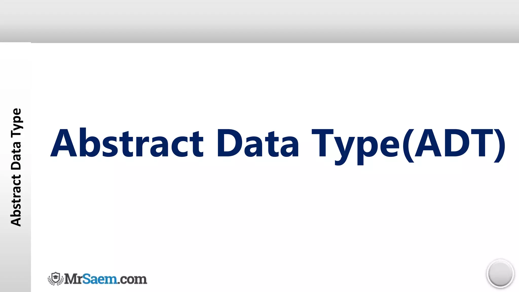 1) An abstract data type (ADT) defines the operations that can be performed on a certain type of data but does not define how those operations are implemented.