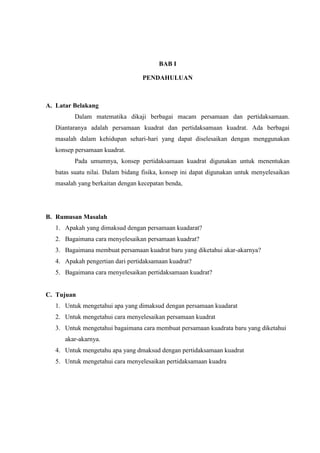 Dokumen ini membahas tentang persamaan kuadrat dan pertidaksamaan kuadrat, termasuk konsep dasar, cara penyelesaian, serta aplikasi dalam kehidupan sehari-hari dan bidang fisika. Terdapat berbagai metode untuk menyelesaikan persamaan kuadrat, seperti pemfaktoran, melengkapkan kuadrat sempurna, dan menggunakan rumus kuadrat. Selain itu, dokumen ini juga menjelaskan tentang diskriminan dan jenis-jenis akar dari persamaan kuadrat.