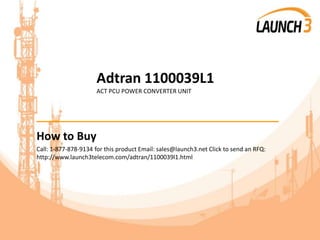 This document provides information about purchasing an Adtran 1100039L1 power converter unit from Launch 3 Telecom. It describes how to purchase the product via phone, email, or by submitting a request for quote online. It also details Launch 3 Telecom's payment options, same-day shipping and order tracking policies, warranty, and additional services offered like repairs and equipment deinstallation.