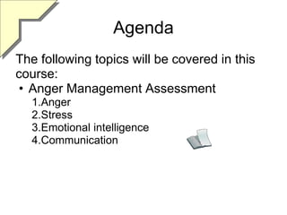 This document outlines an anger management facilitator certification training program. The training will cover topics like anger assessment, self-awareness, communication skills, and emotional intelligence. Upon completion, participants will be able to recognize unhealthy behavior patterns, develop an understanding of anger and stress responses, and learn new coping skills to handle emotions. The curriculum uses tools like a control log workbook and contrasting wheels of behavior. It teaches skills in self-awareness, self-control, social awareness, and relationship management through psychoeducational exercises and role plays. The goal is to help individuals change unacceptable behavioral patterns by increasing their emotional intelligence.