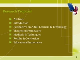 The document presents an exploratory study on the needs of adult learners in adapting to today's technological workforce and social media. It highlights the unique challenges adult learners face and emphasizes the importance of integrating technology in education to enhance learning outcomes. The study concludes that with proper training, adult learners can become highly motivated and capable of leveraging technology for lifelong learning.