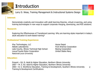 The document discusses the importance of adapting adult learning styles from traditional classroom settings to the workplace, highlighting the need for innovative training methods that cater to diverse learning preferences. It emphasizes the significance of understanding generational differences and providing flexible training solutions that align with varying learning styles. The author, Larry D. Weas, draws on his extensive educational and professional background to outline strategies that facilitate effective learning and performance in a corporate context.