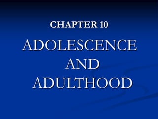 This document discusses development through adolescence and adulthood. It covers physical, cognitive, and social development at each stage. In adolescence, it describes the physical changes of puberty like growth spurts and secondary sex characteristics. Cognitively, adolescents reach formal operations allowing abstract thought. Socially, peers become important and gender roles narrow. Development continues into early, middle, and late adulthood with changes in each domain.