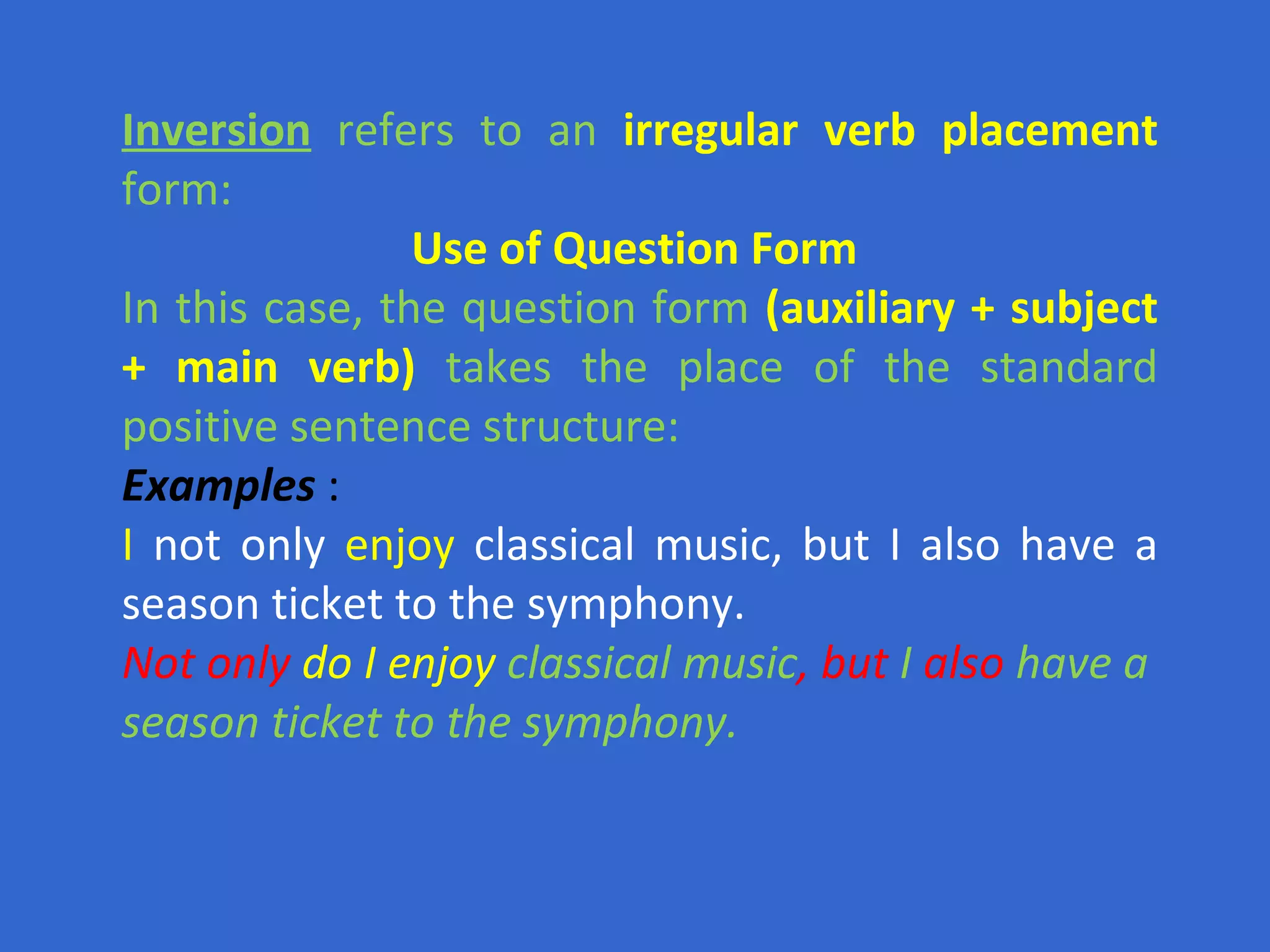 The document discusses different types of inversion in English grammar including question inversion, inversion with negative adverbials, inversion after "only" and "little", and inverted conditional forms. Question inversion involves placing the auxiliary verb before the subject as in "Do I enjoy classical music?". Inversion can also occur with negative time expressions like "never" or "seldom" placing them before the subject. Inversion is also used after expressions like "only after" or "little" for emphasis. Some conditional sentences use inversion by dropping "if" and moving the conditional clause to the front for a more formal tone.