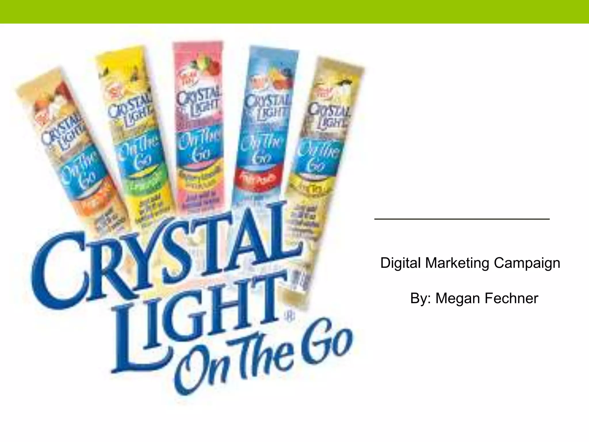 This digital marketing campaign by Kraft Foods targets college-aged adults aged 18-35 through distributing free samples of their Crystal Light product on campuses, holding a flavor creation contest, and utilizing internet marketing and social media. With a budget of $50 million, the goals are to reach both male and female consumers in this demographic with a low-calorie, easy to use, and affordable drink that comes in multiple flavors, which will be measured through sales increases after the campaign.