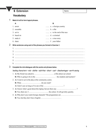 1. The document contains a vocabulary exercise about matching phrases and writing sentences with them.