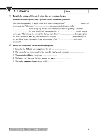 The document contains a vocabulary exercise with 6 sections. Section 1 asks the reader to complete logical second sentences to pairs of sentences. Section 2 asks the reader to complete sentences using phrasal verbs provided in bold. Section 3 asks the reader to complete sentences using words provided in bold. Section 4 asks the reader to complete sentences using words provided. Section 5 asks the reader to complete a passage using words provided. Section 6 asks the reader to replace words in bold with suitable alternatives.