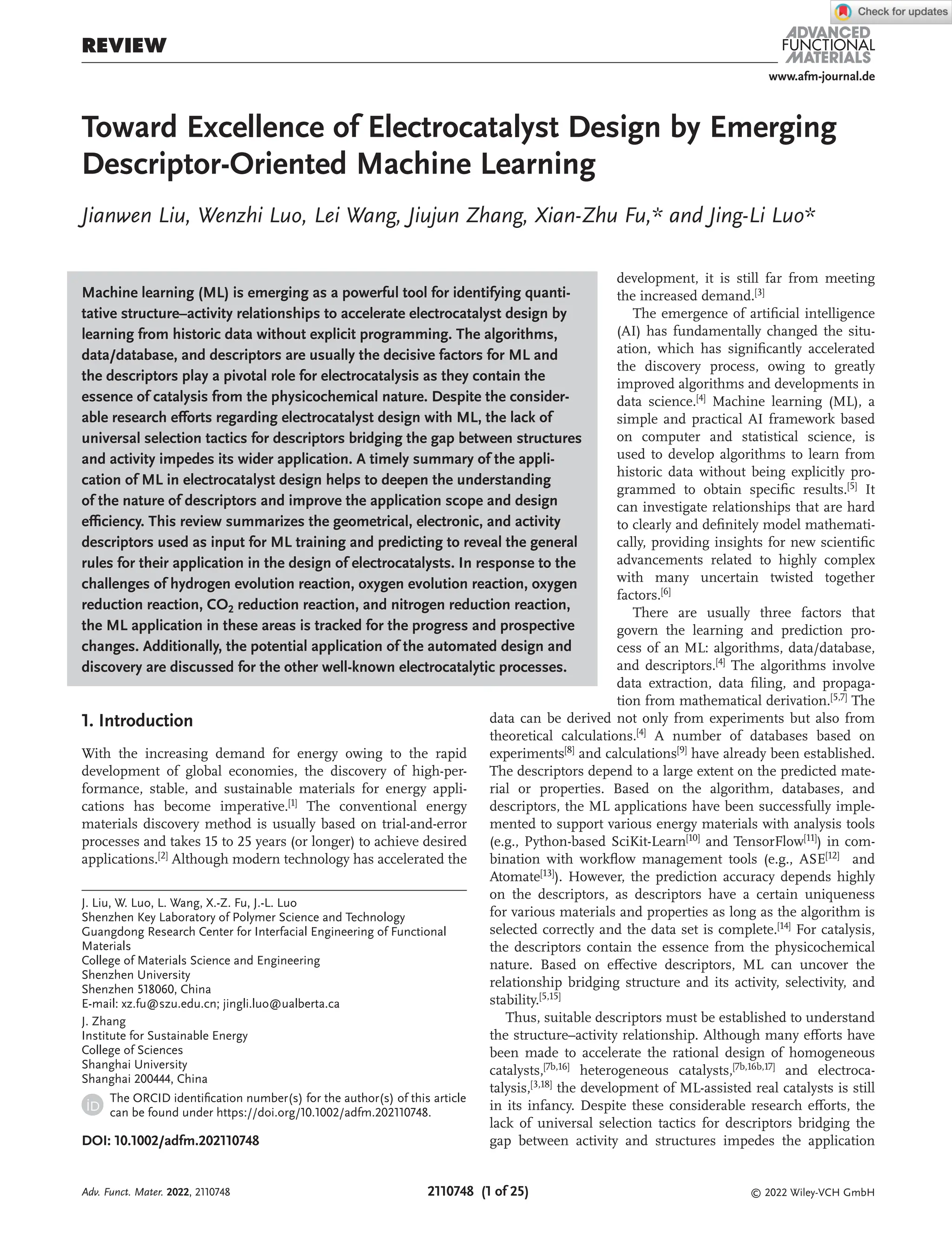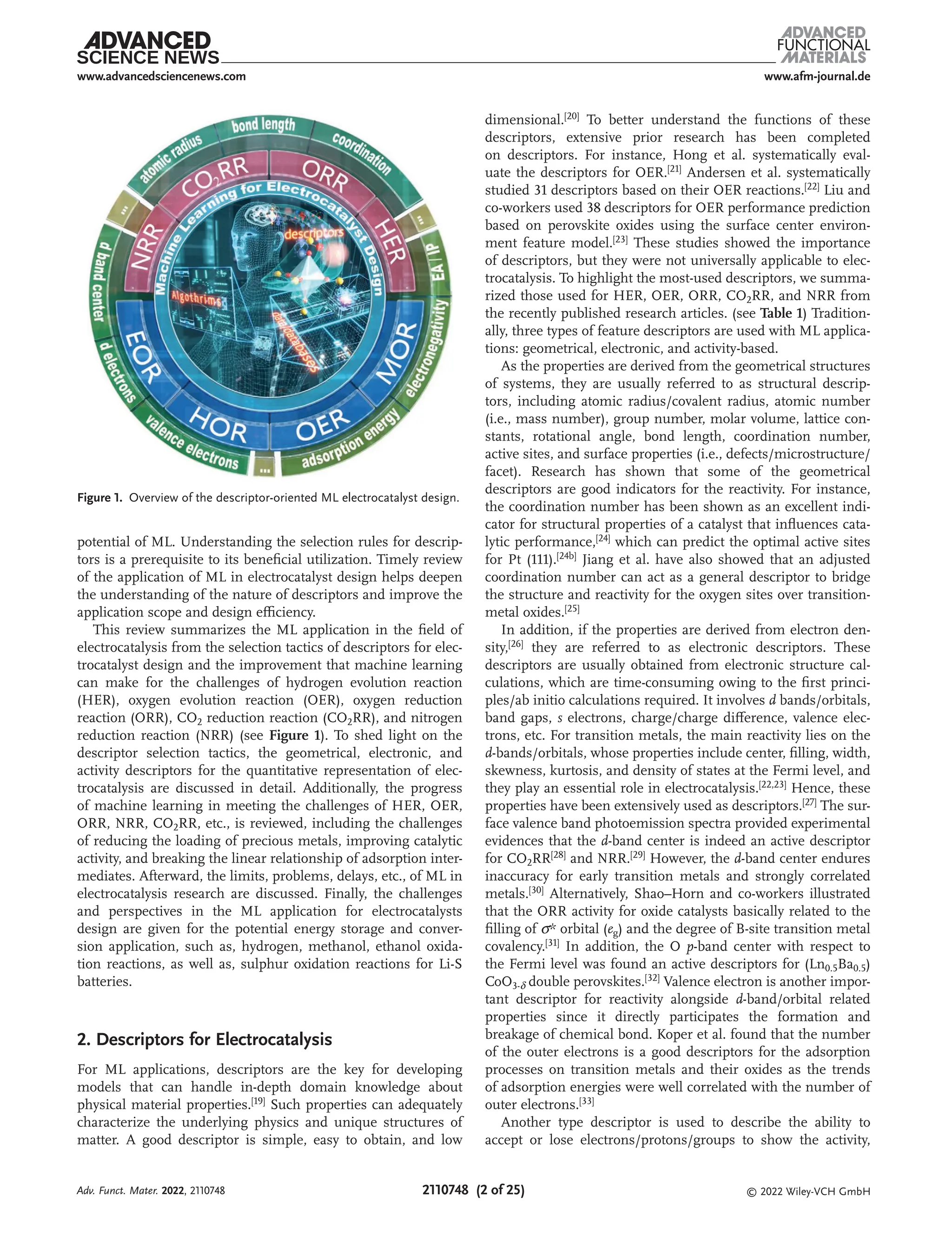 The document discusses the role of machine learning (ML) in accelerating the design of electrocatalysts by utilizing historical data to identify quantitative structure-activity relationships. It highlights the significance of descriptors—geometrical, electronic, and activity-based—in improving prediction accuracy and model effectiveness in electrocatalysis research. Despite substantial advancements, challenges remain in creating universal selection tactics for descriptors that effectively bridge the gap between material structures and their catalytic activities.