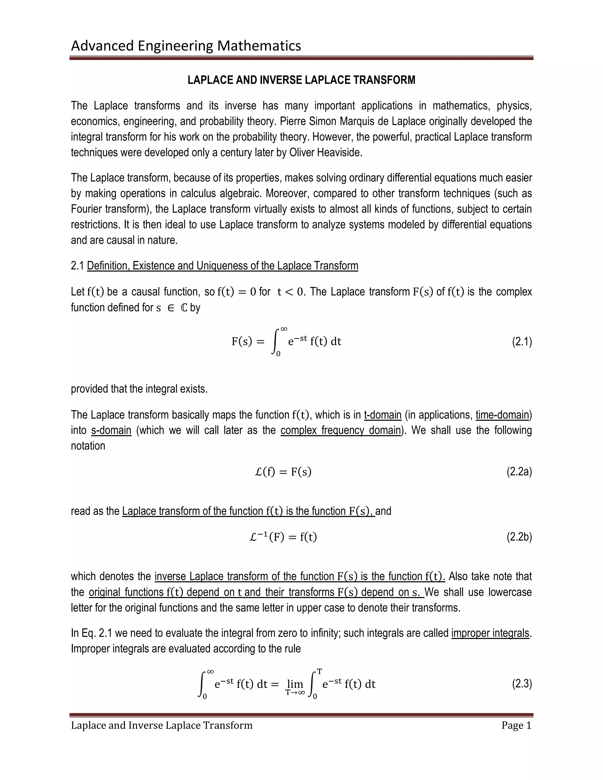 The document discusses the Laplace transform and its applications. The Laplace transform maps functions defined in the time domain to functions defined in the complex frequency domain. It makes solving differential equations easier by converting calculus operations into algebra. Some key properties include: the Laplace transform of derivatives can be obtained algebraically instead of using calculus rules, and the transform allows shifting between time and complex frequency domains. Examples are provided to illustrate definitions, properties, and how to use Laplace transforms to solve initial value problems for ordinary differential equations.