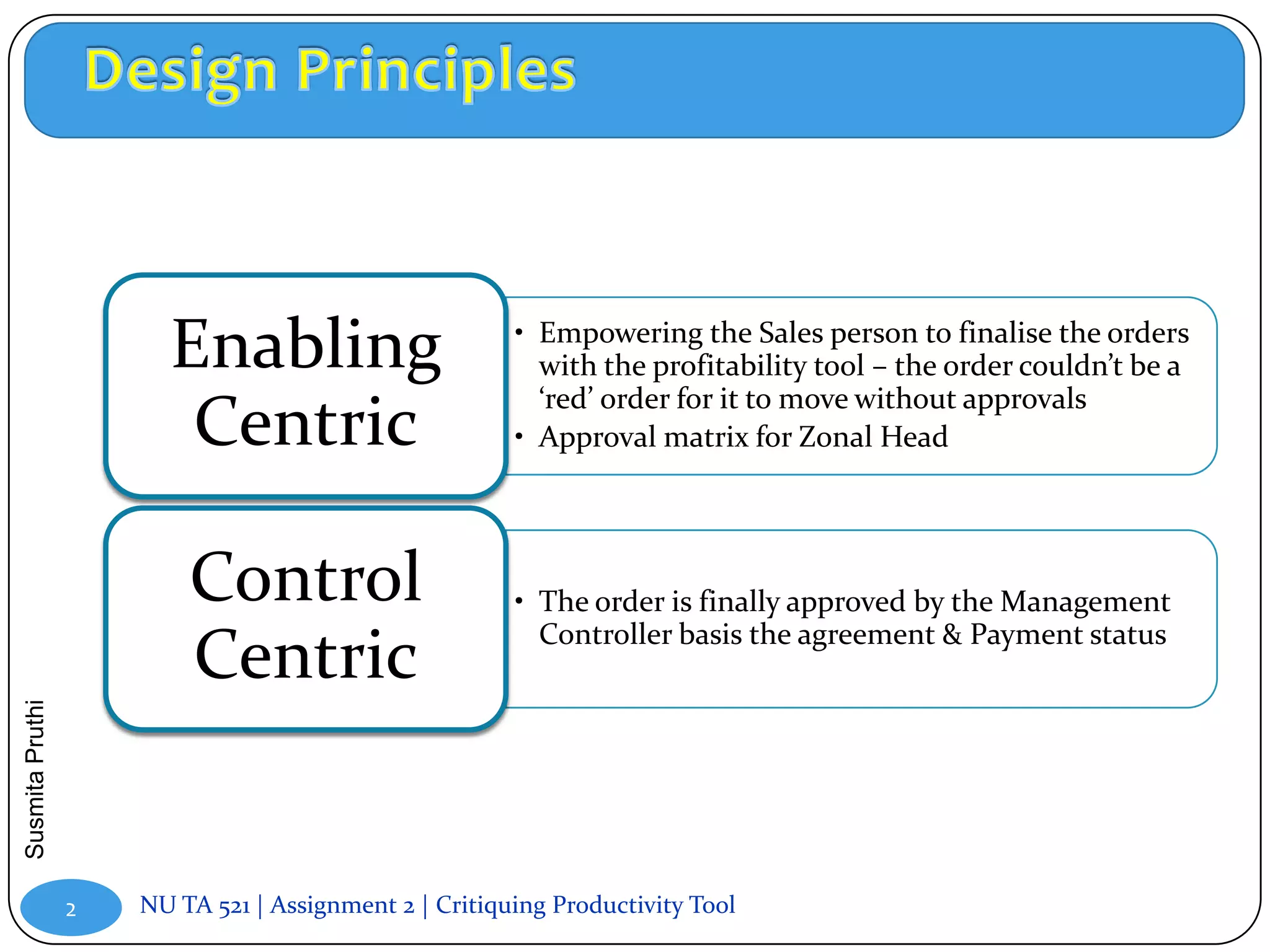 The document discusses critiquing a productivity tool used in the workplace. It asks the reader to determine if the tool uses enabling-centric, control-centric, or a combination of principles in its design. The reader is also asked to recommend changes to the tool, aspects that should stay the same, and which principles the tool should follow given the organization's context. Specifically, it recommends decentralizing decision making, facilitating effective cross-functional workflows, and ensuring all processes meet compliance parameters.