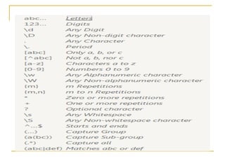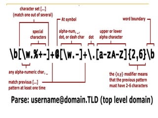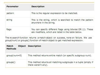 The document discusses regular expressions and text processing in Python. It covers various components of regular expressions like literals, escape sequences, character classes, and metacharacters. It also discusses different regular expression methods in Python like match, search, split, sub, findall, finditer, compile and groupdict. The document provides examples of using these regular expression methods to search, find, replace and extract patterns from text.
