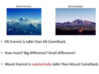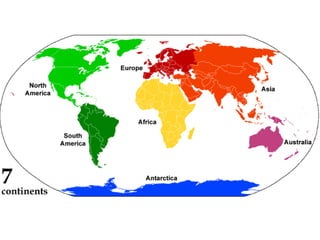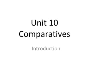 The document introduces comparatives and provides examples comparing characteristics of different countries and geographical features using terms like "taller", "smaller", "larger", "older", and "more people". It advises building comparisons step-by-step by first ensuring the basic sentence is correct before adding specific details like "how much" larger or older something is. It also lists the seven continents and five oceans and provides an activity where students will write basic comparison sentences about countries.