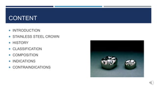 This document provides an overview of stainless steel crowns for pediatric dentistry. It discusses the history, composition, indications, contraindications, advantages and disadvantages of stainless steel crowns. It describes different types of crowns based on composition and morphology. The document outlines the armamentarium, techniques, adaptations and modifications for stainless steel crowns. It is intended to serve as a reference for using stainless steel crowns in treating pediatric dental patients.
