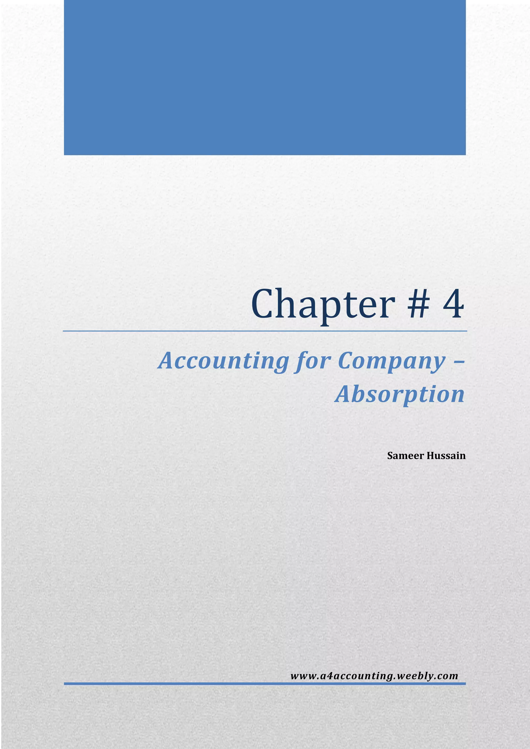 This document provides information about accounting for company absorption. It defines absorption as when one company acquires another and the acquired company ceases to exist while the acquiring company continues. It discusses purchase consideration, which is the amount paid by the new company, and can be calculated via net asset method or lump sum method. It provides journal entries for both the old and new companies, and includes two illustrations applying the concepts to example company mergers.