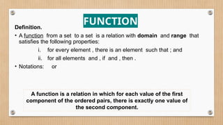 The document provides a comprehensive overview of functions, defining crucial components like domain, range, and types of functions including linear, absolute value, and quadratic functions. It explains the concept of functions as relations and describes how to determine if a relation is a function through examples and graphical representations. The document also emphasizes the importance of the vertical line test in identifying functions from their graphs.