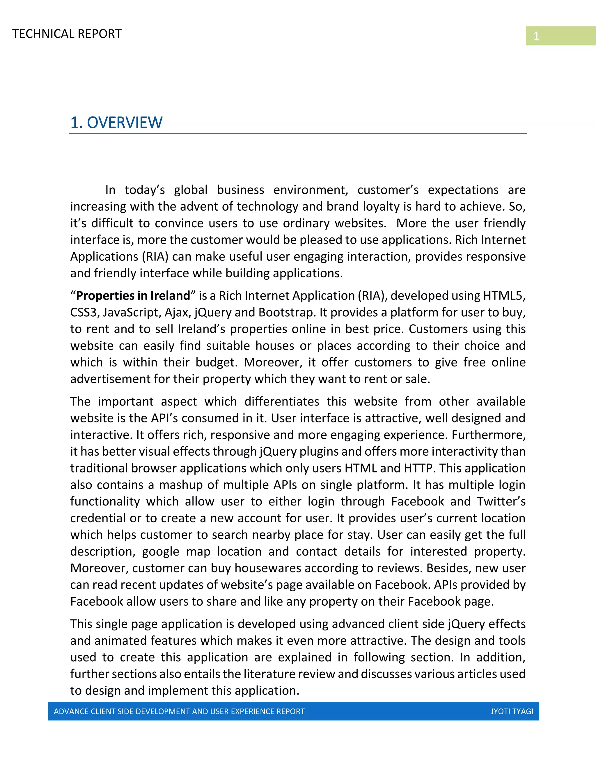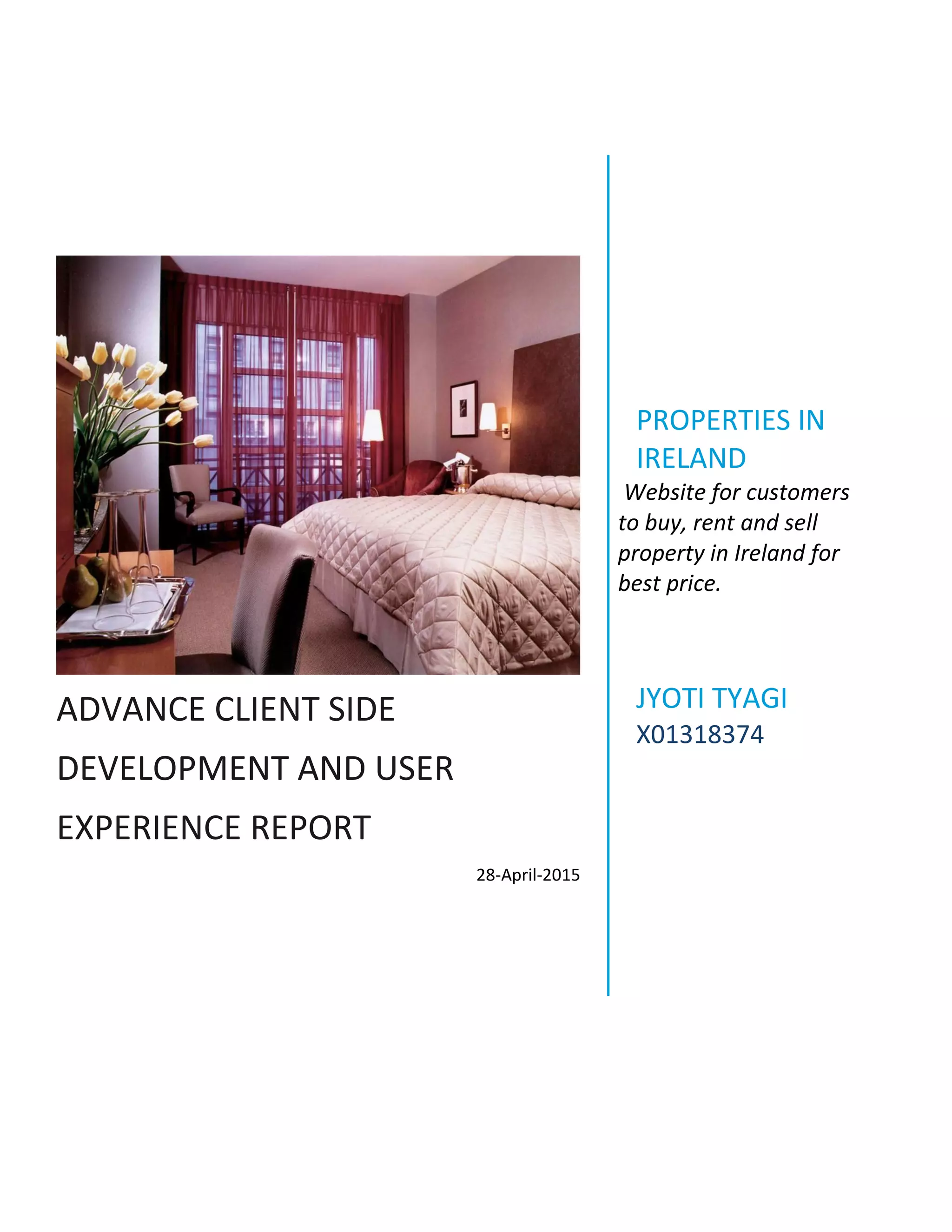The document describes a website called "Properties in Ireland" that allows users to buy, rent, and sell property in Ireland. It uses technologies like HTML5, CSS3, JavaScript, Ajax, jQuery and Bootstrap to provide a rich user interface. The website aims to provide users with an easy-to-use platform to search for suitable properties within their budget. It also offers free online advertising for users to rent or sell their own properties.
