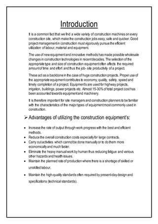 The document discusses various types of equipment used in construction projects. It describes earth-moving equipment such as excavators, backhoes, front shovels, draglines, clamshell buckets, and bulldozers. Excavators are used for digging trenches, holes and foundations. Backhoes are commonly used to dig holes and trenches. Front shovels are mounted on tracks and used for digging and loading earth or rock. Draglines excavate soft earth below ground level, while clamshell buckets lift material vertically. Bulldozers push large quantities of soil and rubble. The document provides details on the uses and applications of these important pieces of heavy construction equipment.