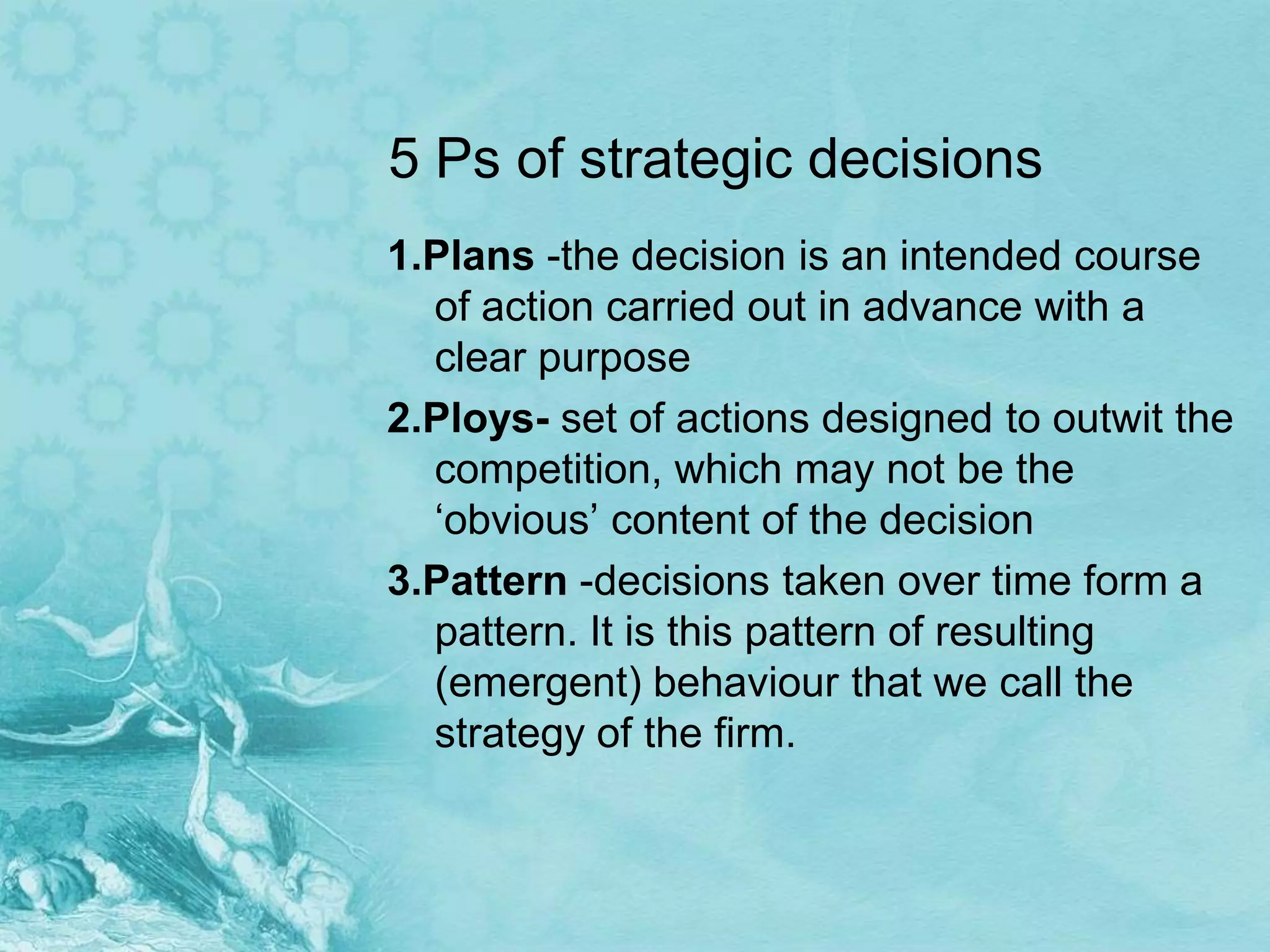 The document discusses strategic decision making and the role of politics within organizations. It outlines 5 Ps of strategic decisions including plans, ploys, patterns, position, and perspective. It also describes different types of strategic decision makers and contexts for decision making. Finally, it analyzes the political activities that occur within each phase of the strategic decision making process, such as controlling agendas, forming coalitions, and selectively advocating for criteria.