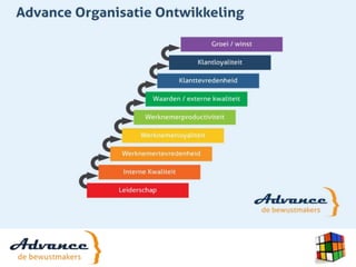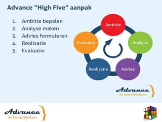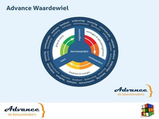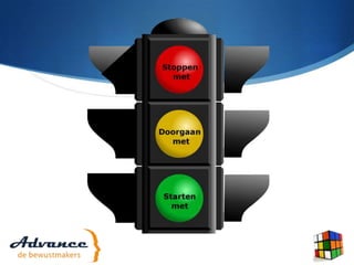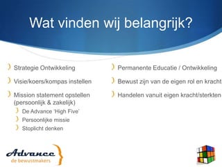 Advance leiderschap 1. 2. Wat vinden wij belangrijk?Strategie OntwikkelingVisie/koers/kompas instellenMission statement opstellen (persoonlijk & zakelijk)De Advance ‘High Five’Persoonlijke missieStoplicht denkenPermanente Educatie / OntwikkelingBewust zijn van de eigen rol en krachtHandelen vanuit eigen kracht/sterkten 5. Uitgangspunt Organisatie OntwikkelingWaar staan we nu en waar willen we naartoe?Hoe kunnen we dat bereiken?Advance helpt mens en organisatie hun sterkten te ontdekken en leiderschap te ontwikkelen.Advance biedt een omgeving die het mogelijk maakt de gewenste groei en ontwikkeling te realiseren. 7. 8. 9. Persoonlijk Mission StatementJezelf (her)ontdekkenOntdekken van je drijfverenVanuit eigen sterkten en keuzen denken en werkenKoers bepalenOntwerpen van leefregels en doelenEen energiek levensplan opstellen 10. 13. Het Advance Stoplicht staat voor de volgende drie vragen:Waar moeten we mee stoppen?Waar moeten we mee doorgaan?Waar moeten we mee starten?