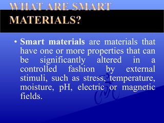 Smart materials can significantly alter their properties in response to external stimuli like stress and temperature. The document highlights various types of smart materials and discusses their applications, including advancements in technology for bikes and creative tools. It emphasizes the interdisciplinary nature of smart material technology and the importance of understanding material composition and microstructure for effective application.