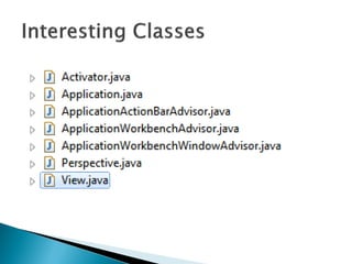 - The entry point for an RCP application is a class that implements IApplication to control application execution and create the workbench.