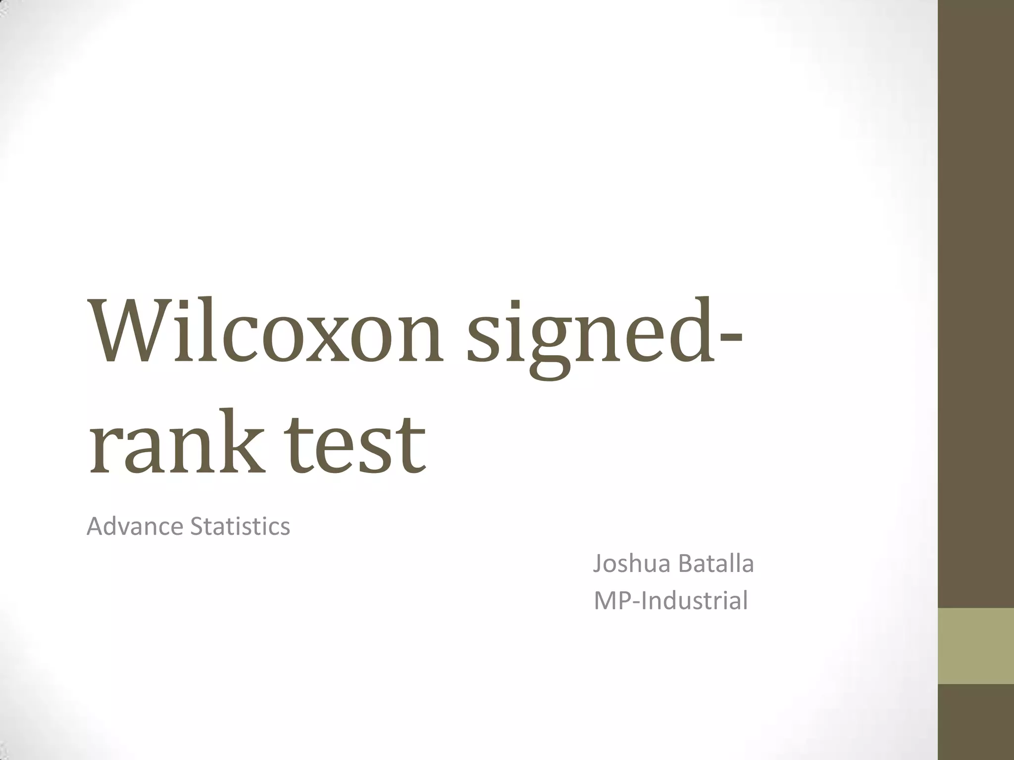 The Wilcoxon signed-rank test is a non-parametric test used to compare two related samples, such as repeated measurements on a single sample, to assess whether their population mean ranks differ. It can be used as a non-parametric alternative to the paired Student's t-test when the population cannot be assumed to be normally distributed. The test involves ranking the differences between pairs of observations and comparing the sum of the ranks of the positive differences to what would be expected if there was no effect. The document provides information on the requirements, formula, and an example application of the Wilcoxon signed-rank test.