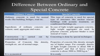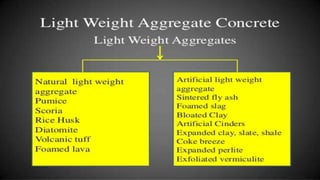 This document provides information on structural light weight concrete. It defines light weight concrete as a special concrete that weighs less than conventional concrete due to using light weight coarse aggregates. These aggregates can be natural materials like pumice or artificial materials like clay that have been fired to develop a porous structure. Light weight concrete has densities between 1440-1840 kg/m3 compared to 2240-2400 kg/m3 for normal concrete. It is used to reduce the dead load of structures, allowing smaller structural elements like columns and footings. Light weight concrete also provides better strength-to-weight and fire resistance properties than normal concrete.