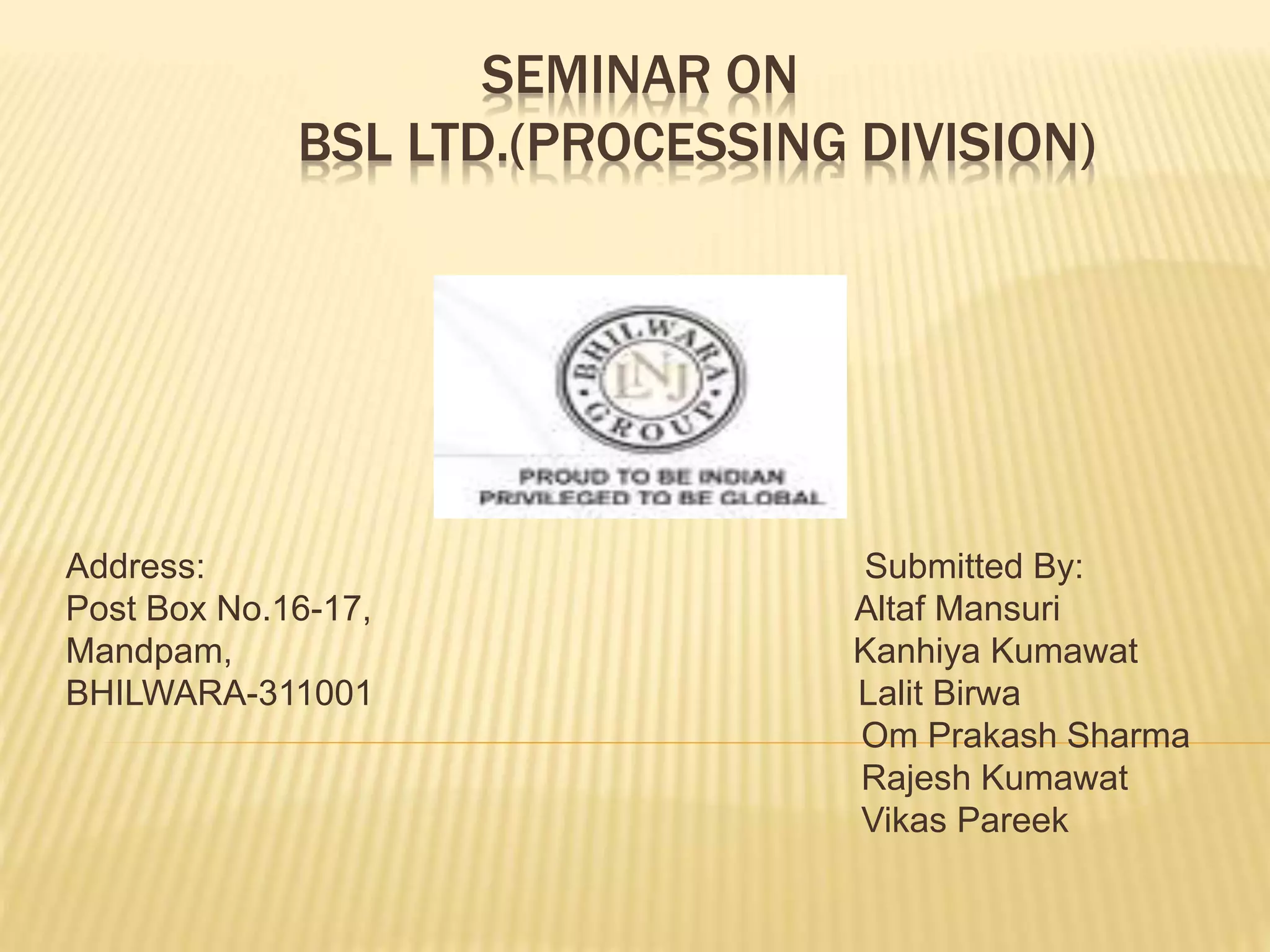 This document provides information about BSL Ltd., a textile company that manufactures fashion fabrics and wool yarn. It discusses the company's departments including quality control, processing, dyeing, and finishing. It describes the various machines and processes used in quality testing, fabric processing, dyeing, weight reduction, drying, and finishing. Key areas covered include quality control procedures for incoming materials, fabric testing at different stages, shade development, and parameters for dyeing and finishing processes.
