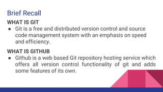 Git is a version control system that allows tracking changes to files, while GitHub is a hosting service for Git repositories that provides additional collaboration features. The document outlines the basic Git and GitHub workflow including initializing a local repository, linking it to a remote GitHub repository, committing and pushing changes, contributing to open source projects by forking repositories and submitting pull requests, and using branches to safely experiment with changes. It also introduces GitHub Pages for hosting static websites directly from a GitHub repository.