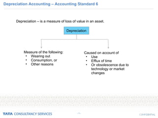 1) Depreciation is the allocation of the cost of a tangible asset over its useful life. It measures the loss of value from wear, tear, obsolescence, and age.