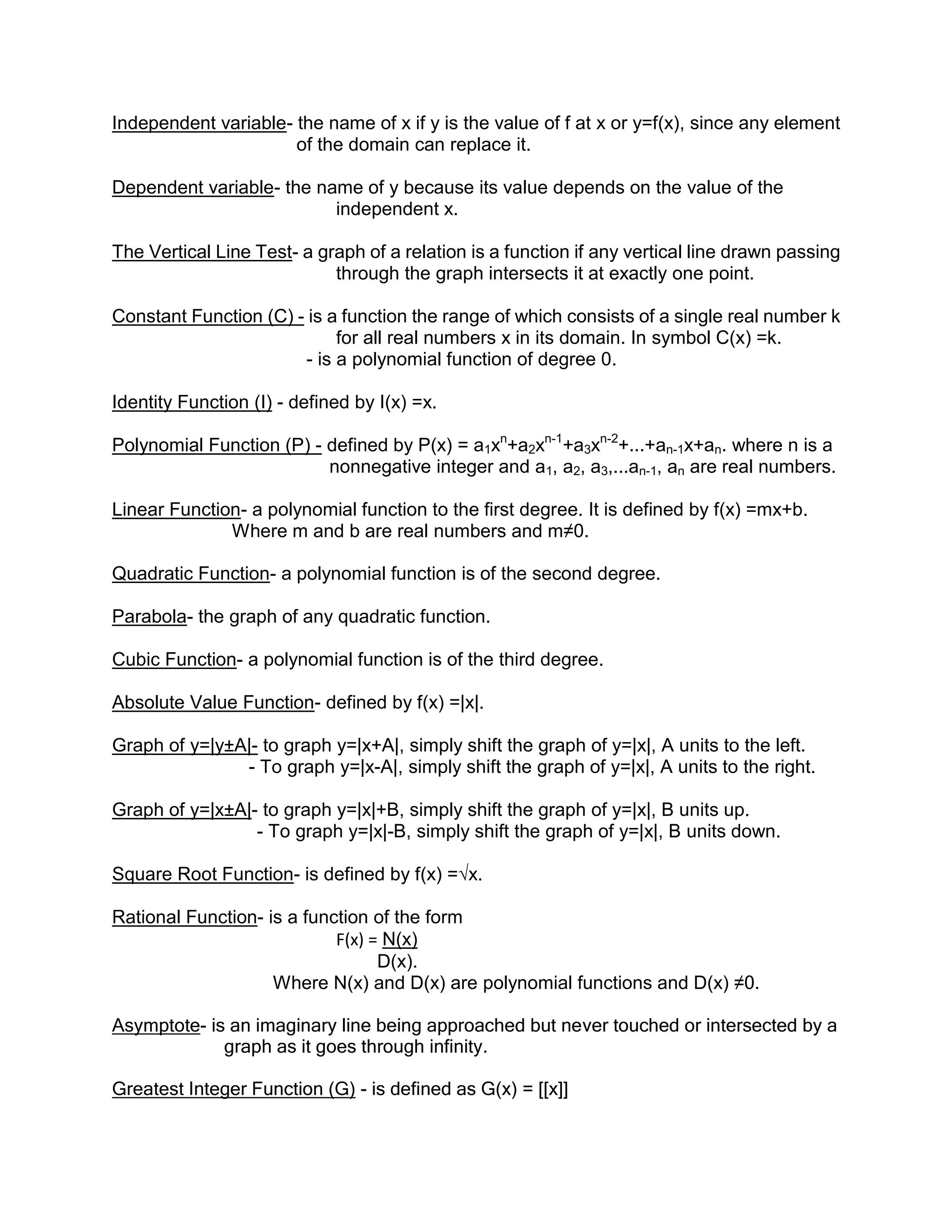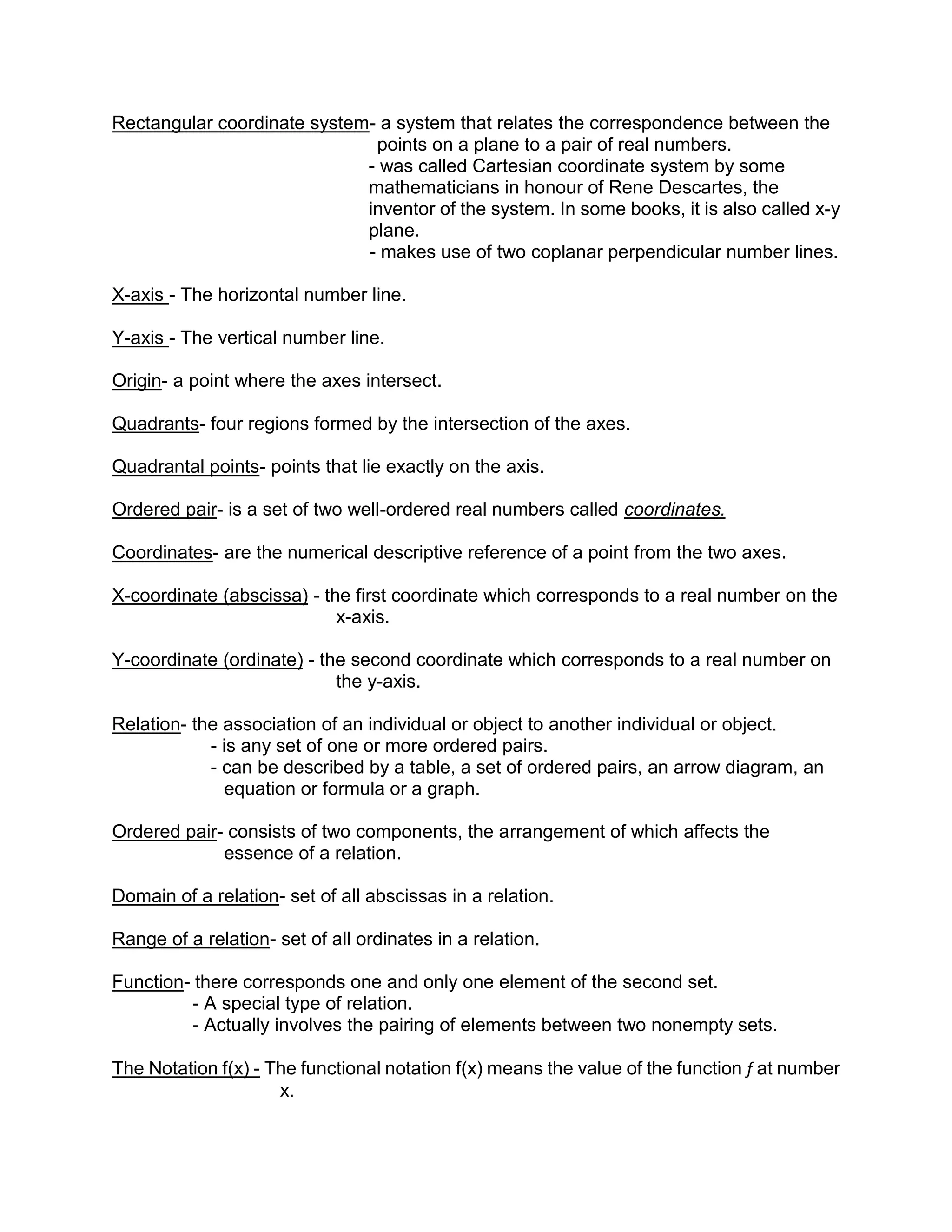 The document defines and describes key concepts related to rectangular coordinate systems and functions. It introduces the x-axis, y-axis, and origin that make up the rectangular coordinate system. It then defines various types of functions like linear, quadratic, absolute value and their graphs. Key characteristics of functions like domain, range, and intercepts are also summarized.