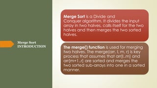 This document presents an overview of the merge sort algorithm. It begins with an introduction explaining that merge sort is a divide and conquer algorithm that divides an input array in half, recursively sorts the halves, and then merges the sorted halves together. It then provides pseudocode for the merge sort algorithm, which works by recursively dividing the array in half until each subarray contains a single element, and then merging the sorted subarrays back together. Finally, it analyzes the time and space complexity of merge sort, concluding that it has time complexity of Θ(nlogn) and space complexity of Θ(n).