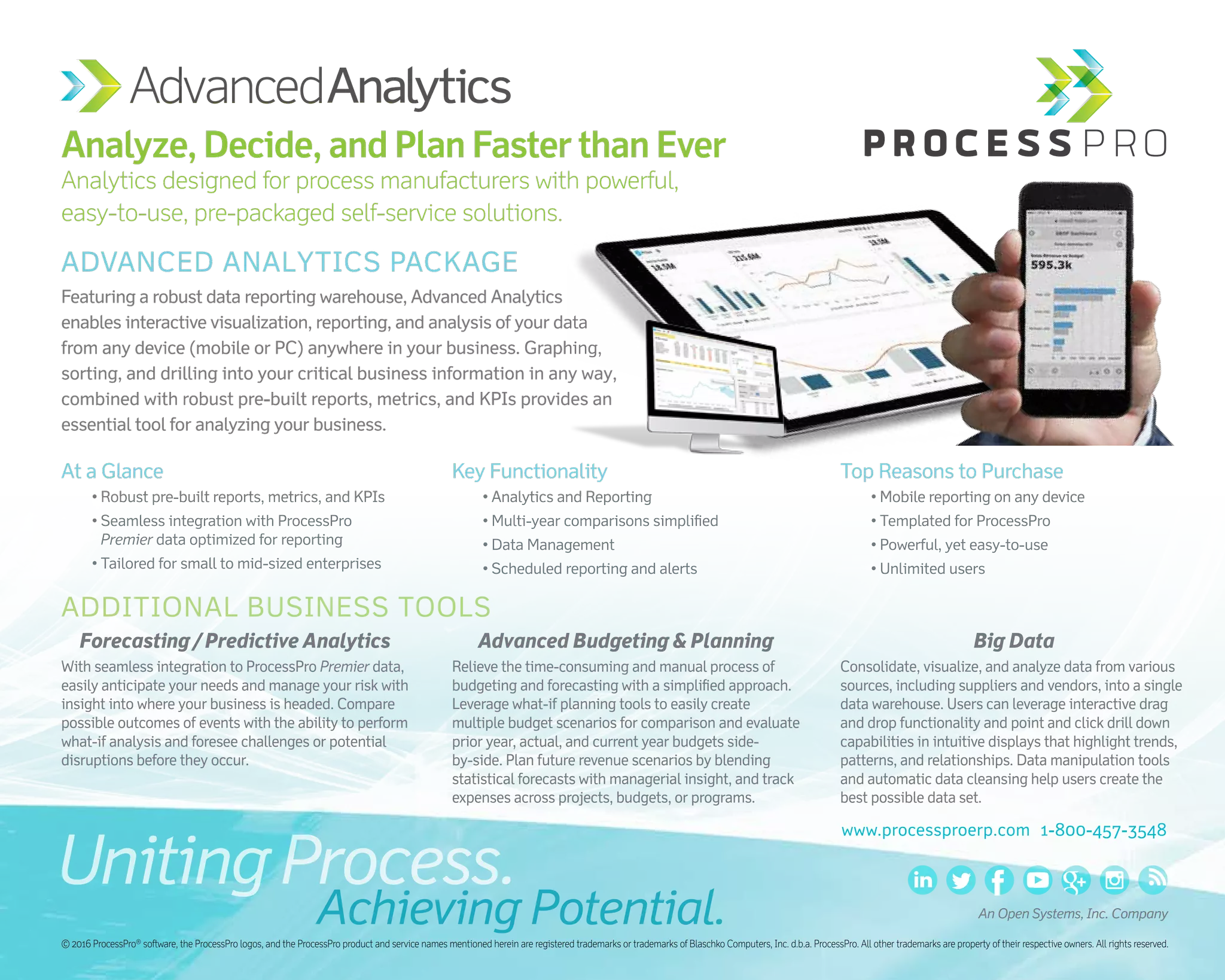 ProcessPro offers advanced analytics software that integrates with a company's data to provide predictive analytics and forecasting capabilities. This allows users to anticipate needs, manage risk, and perform what-if analysis. Additional tools include advanced budgeting and planning functionality as well as big data consolidation and analysis across various sources. The advanced analytics package features pre-built reports, metrics, KPIs and seamless integration with ProcessPro Premier data to enable interactive visualization and analysis on any device.