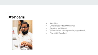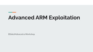 1. The document outlines an agenda for a workshop on advanced ARM exploitation. The agenda includes introductions to memory corruption, buffer overflows, format string exploitation, and techniques for bypassing exploit mitigations like DEP using return-oriented programming (ROP).