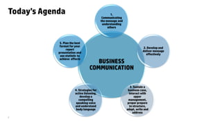 This document discusses various aspects of business communication, including communicating messages effectively, developing and delivering messages, writing business cases, communicating with upper management, and strategies for communication in today's business environment. The document provides guidance on topics such as the communication process, writing emails, developing business cases, relating to upper management, using language of leadership, and writing clear narratives, goals and milestones.