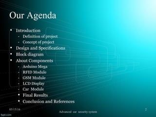 The document describes the design of an advanced car security system using RFID, GSM, and an Arduino board. The system is intended to prevent car theft by only allowing an authorized RFID card to start the car. If an unauthorized card is used, the system will send a call to the owner's phone using GSM and stop the car once the owner responds. The document outlines the components, design, block diagram, and results of testing the system. It concludes that the system enhances car security while allowing for authorized access.