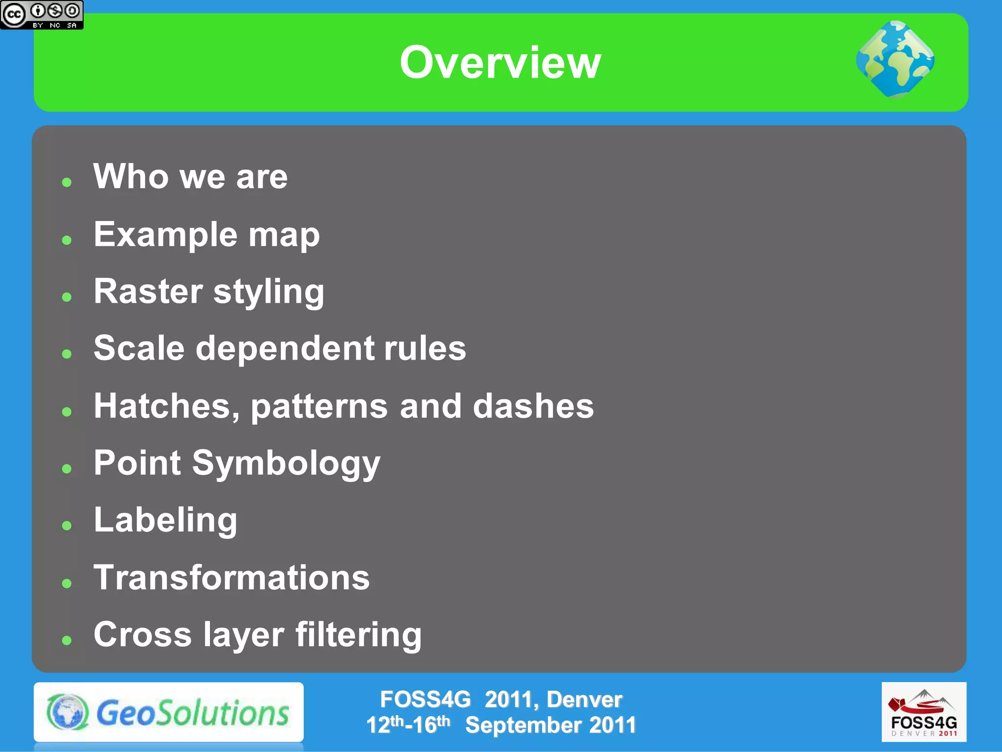 This document is a presentation about advanced cartographic map rendering in GeoServer. It discusses GeoSolutions, an example map, raster styling techniques like hillshading, scale dependent rules, hatches and patterns, point symbology, labeling, transformations, and cross-layer filtering. It provides code examples and links to demonstration maps and data.