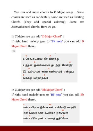 The document discusses adding advanced chords beyond the basic major chords when playing in the key of C major. It introduces additional major chords like D major and Bb major that can be added if the right hand melody lands on certain notes. Minor chords like F minor are also discussed as "coloring chords" that add sadness. Dominant 7th chords and jazz chords like minor 7th and major 7th chords are then covered along with examples of when and how to use them. The purpose is to provide options for making the music more interesting and adding different feelings through extended chord choices.