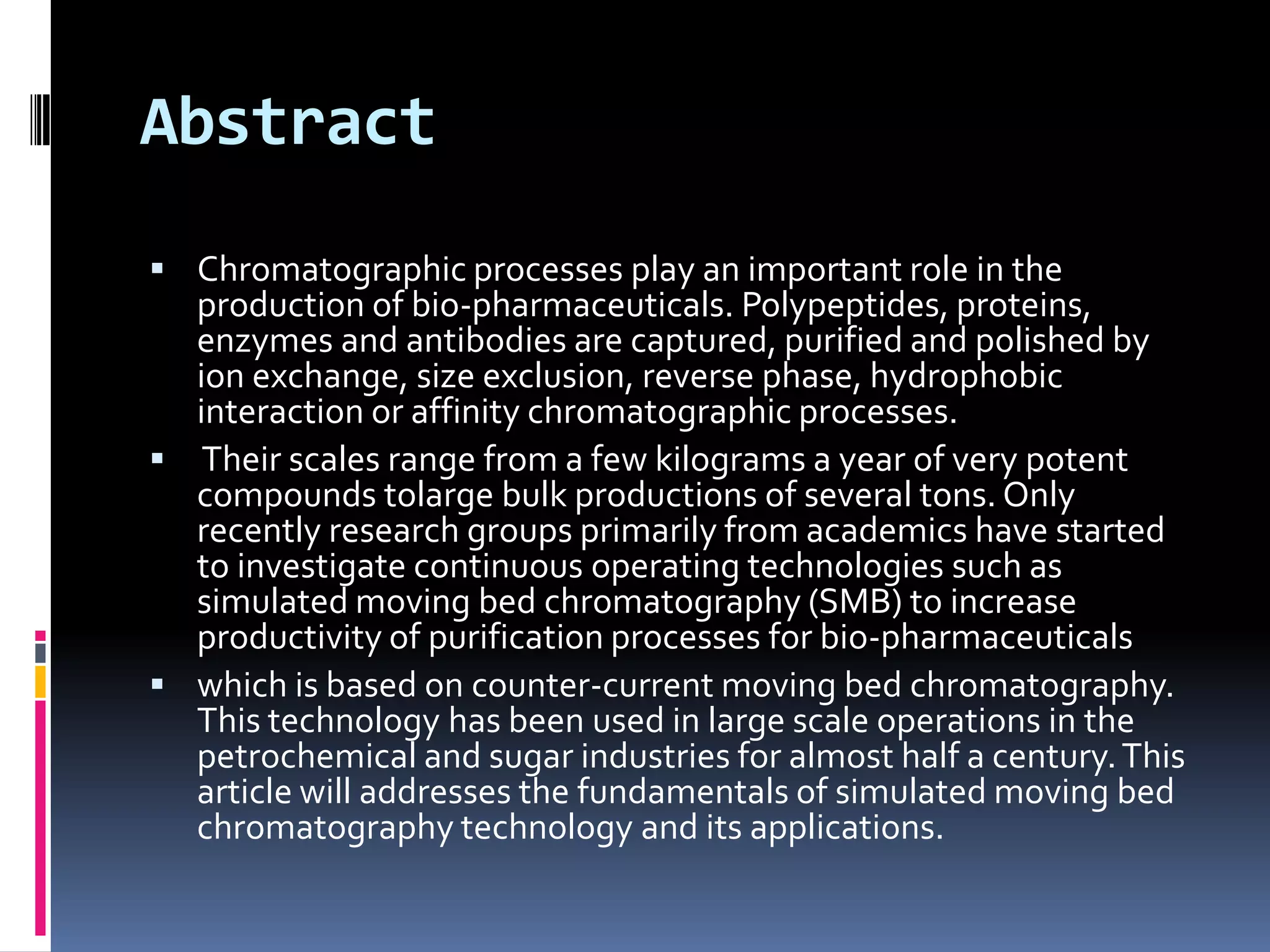 Simulated moving bed (SMB) chromatography is an advanced continuous purification technique widely applied in the pharmaceutical and petrochemical industries for separating complex mixtures into high-purity fractions. It enhances productivity while significantly reducing solvent consumption compared to traditional batch chromatography, making it preferred for large-scale operations. The technology has evolved to include various operational modes and is recognized for its effectiveness in the chiral separation of compounds and the purification of bio-pharmaceuticals.