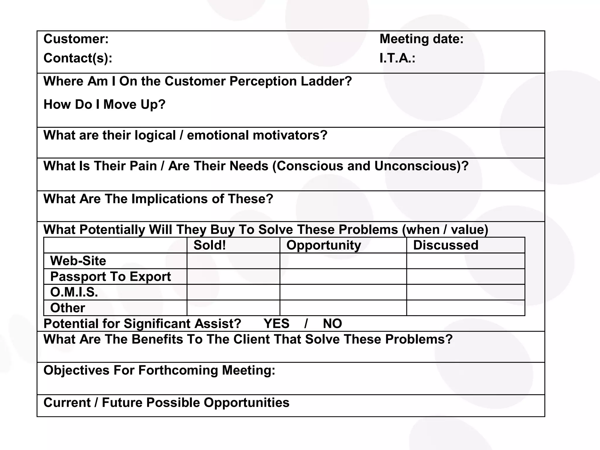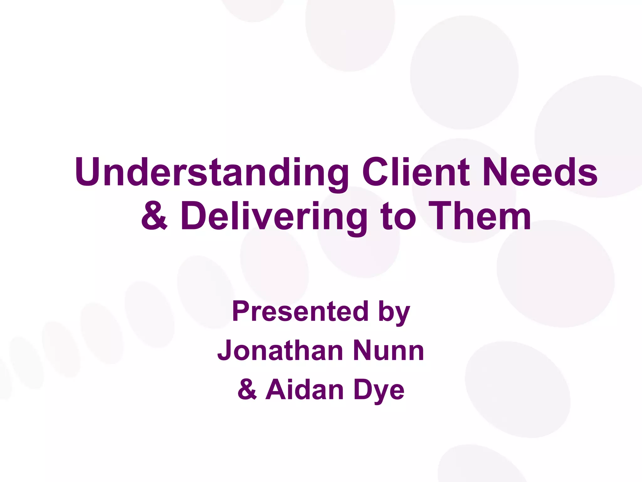 The document outlines an approach to understanding client needs and delivering solutions to them. It discusses drawing ideas from proven sales techniques and business research to help clients develop their business. The workshop aims to have an interactive discussion to share ideas and develop solutions. It emphasizes understanding problems, implications, and client motivations in order to present relevant and beneficial solutions through a consultative two-phase approach.