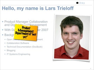 Lars Trieloff presented on advanced collaboration tools available now for Communiqué, including blogs, wikis and calendars. The presentation described features of each tool and provided examples of how they can be used for internal collaboration or public engagement. Trieloff concluded by previewing the next generation of collaboration with Social Collab, which will integrate social networking, gadgets, OpenID and microformats.