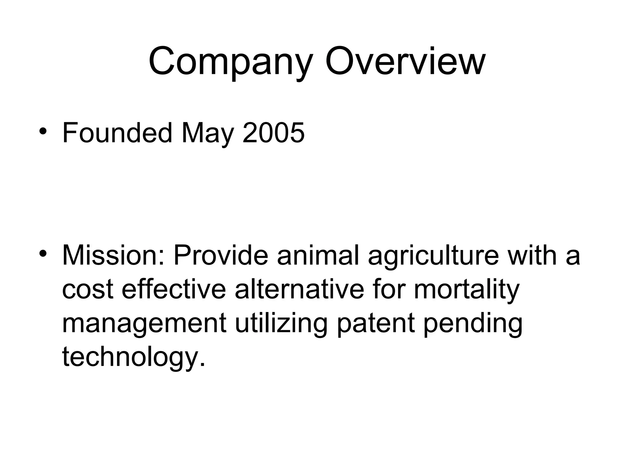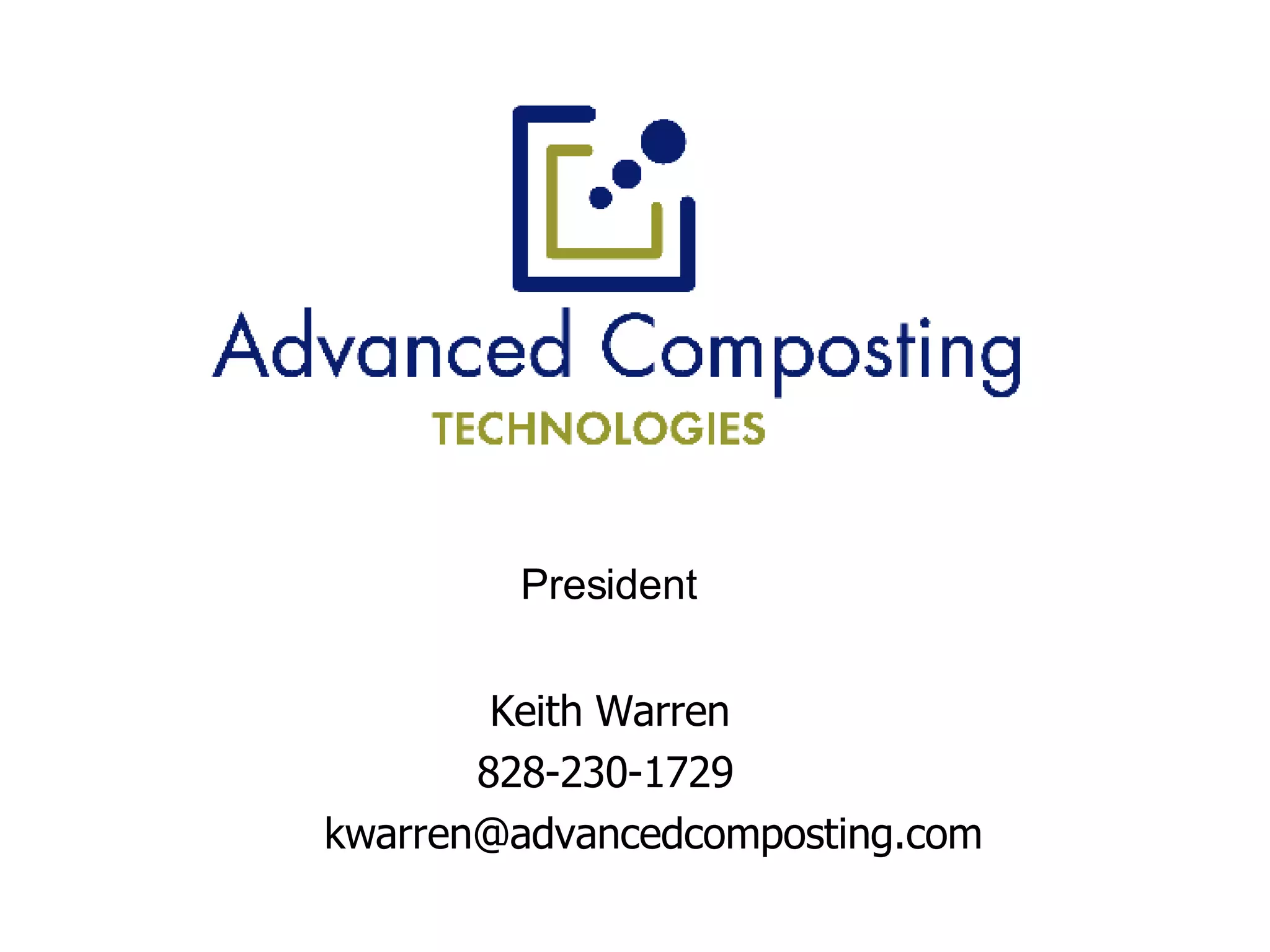 Advanced Composting Technologies is a company founded in 2005 that provides cost-effective mortality management for animal agriculture using patented composting technology. The document describes a 16-bin composting facility located on a hog farm in Ayden, North Carolina that can process up to 10,000 pounds of mortality per bin, maintaining temperatures of 150 degrees Fahrenheit to kill pathogens over 28 days before land application of the finished compost.