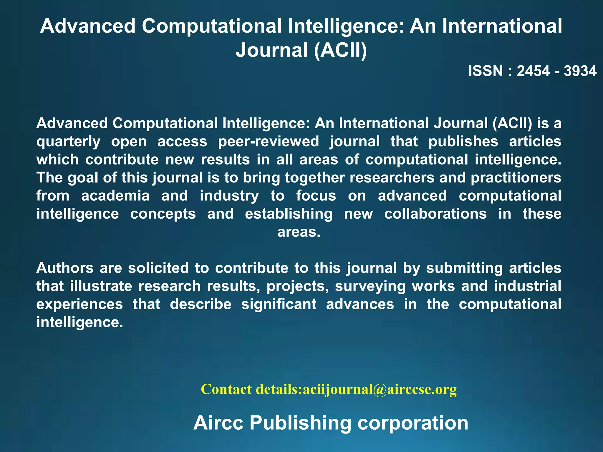 Advanced Computational Intelligence: An International Journal (ACII) is a quarterly peer-reviewed journal that publishes articles on computational intelligence. The goal of the journal is to bring together researchers and practitioners from academia and industry to advance the field through publishing research on topics such as artificial intelligence, neural networks, fuzzy logic, evolutionary computation, and more. Authors are invited to submit original papers on new developments in computational intelligence.