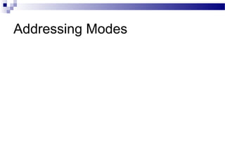The document discusses various addressing modes used in instruction sets including immediate, direct, indirect, register, register indirect, displacement, indexed, stack, and relative addressing. It provides the algorithms and merits and demerits of each mode. For example, immediate addressing has the operand value in the instruction but is limited in magnitude, while indirect addressing allows a large address space but requires multiple memory references. The document also summarizes addressing modes for various processors like Pentium, x86, PowerPC and their calculations.